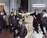 Geldausgabestelle der Reichsband im Oktober 1923 : Waschkörbe werden für den Transport der Geldscheine bereitgehalten