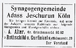 Anzeige der orthodoxen Synagogengemeinde Adass Jeschurun aus dem Jüdischen Beobachter 1921/22 über die koscheren Metzgereien in der Stadt