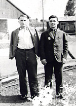 Russische Zwangsarbeiter in Köln, um 1942/43 (an der Brust deutlich sichtbar das „OST“-Abzeichen zur Kennzeichnung der Zwangsarbeiter)
