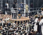 Adolf Hitler während einer Wahlrede in Siemensstadt am 10. November 1933 vor der Volksabstimmung über den Austritt Deutschlands aus dem Völkerbund (koloriertes Propagandafoto)