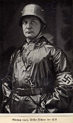 1922 machte Göring die Bekanntschaft Hitlers, trat der NSDAP bei und übernahm Aufbau und Führung der SA. Bei seiner Teilnahme am fehlgeschlagenen Novemberputsch 1923 in München ("Marsch auf die Feldherrenhalle") wurde er schwer verwundet. Mitte der Zwanziger Jahre wurde er dann aber wegen seiner Morphiumsucht u. a. aus der NSDAP ausgeschlossen.