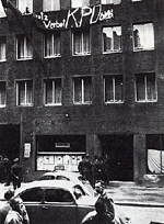 Das Gebäude des Bundesvorstandes der KPD in Düsseldorf am Tag des Parteienverbots durch das Bundesverfassungsgericht, 17. August 1956