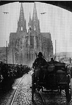 Deutsche Truppen ziehen am 7. März 1936 über die Hohenzollernbrücke ins linksrheinische Köln ein.