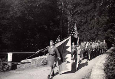 Marsch der Neudeutschland%2DGruppe aus K%F6ln%2DLindenthal zur Klosterkirche in Marienstadt um 1932