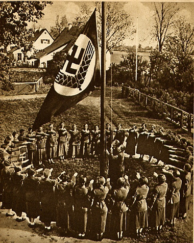 Flaggenappell in einem Lager des "Reichsarbeitsdienstes" (Propagandafoto)