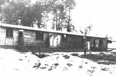 Eine der Baracken des %22W%2EE%2E%2DBew%E4hrungslagers%22 in Ellern %28Hunsr%FCck%29 im Jahr 1945